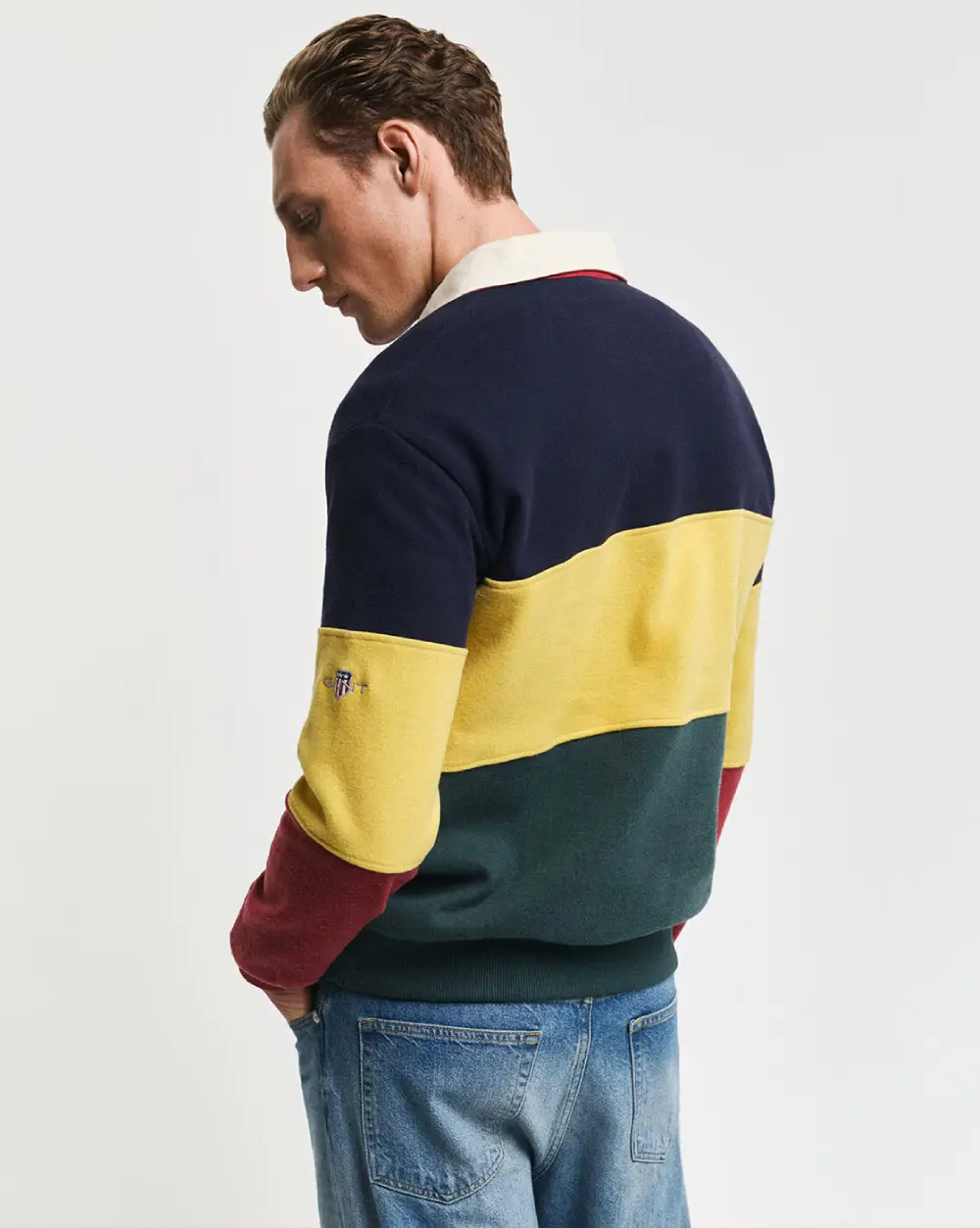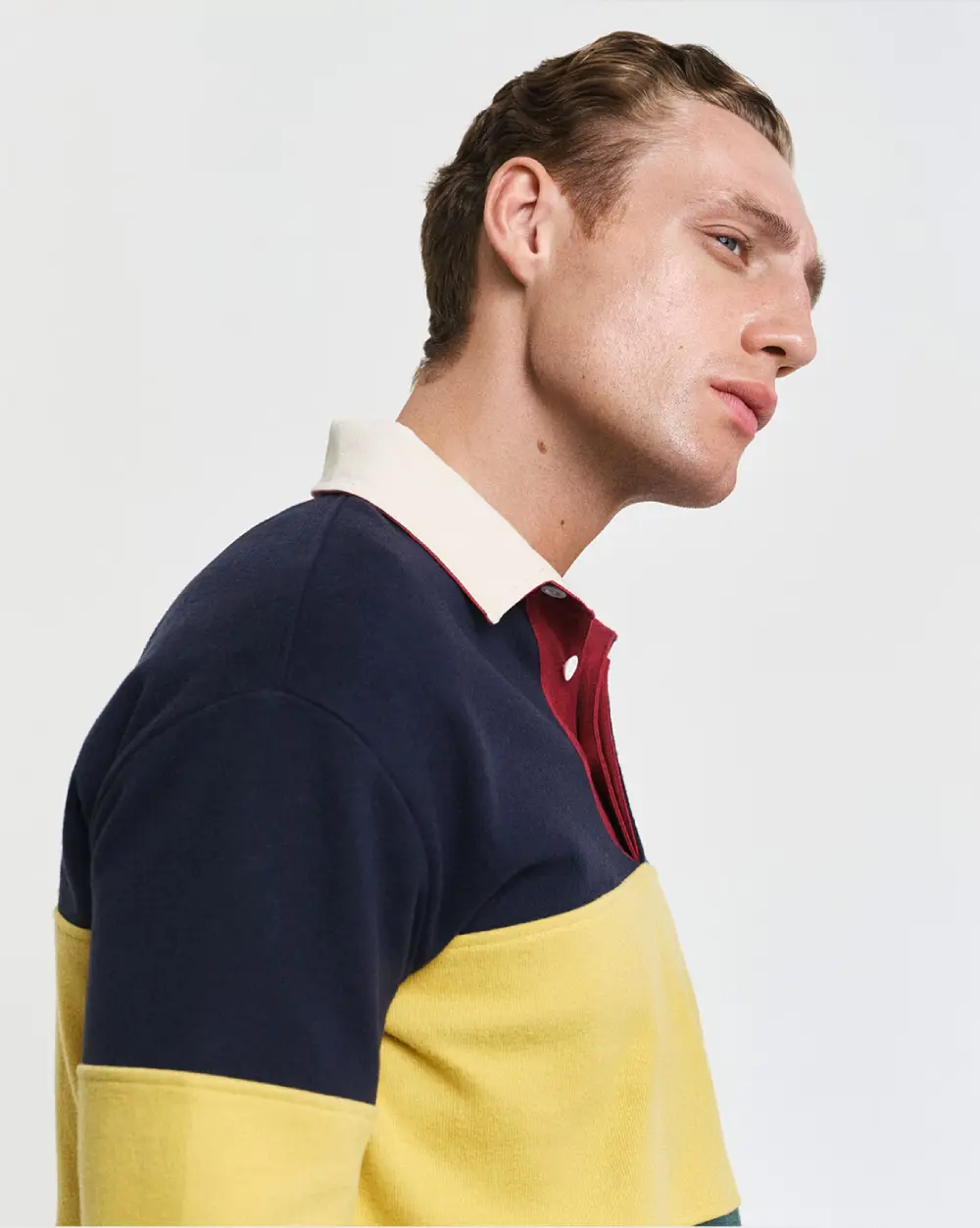 - Effortlessly cool, this blue cotton sweatshirt boasts a relaxed fit, colorblocked design, and a spread collar. Full sleeves and button closure add a touch of sophistication to this casual essential.